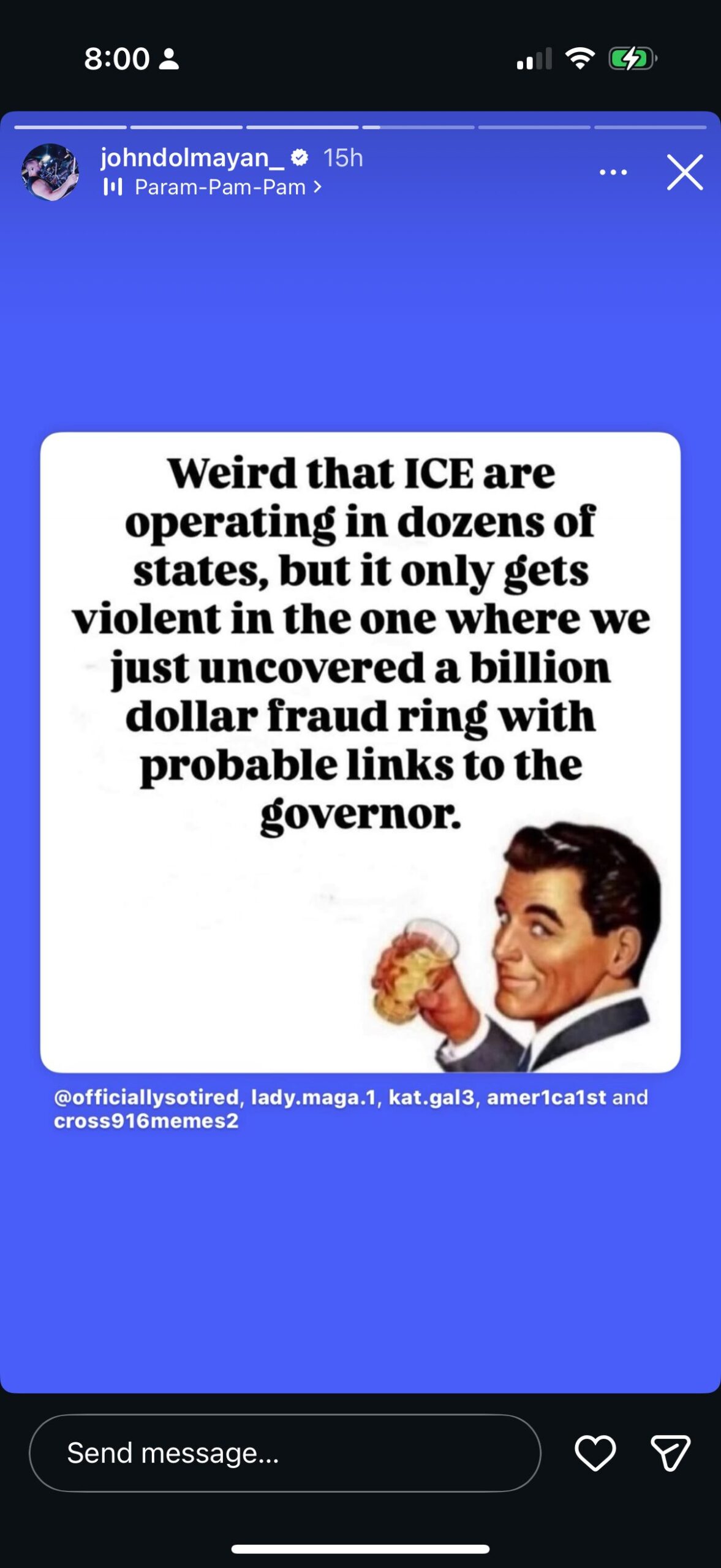 He shared a post that said, “Weird that ICE are operating in dozens of states, but it only gets violent in the one where we just uncovered a billion dollar fraud ring with probable links to the governor.”
